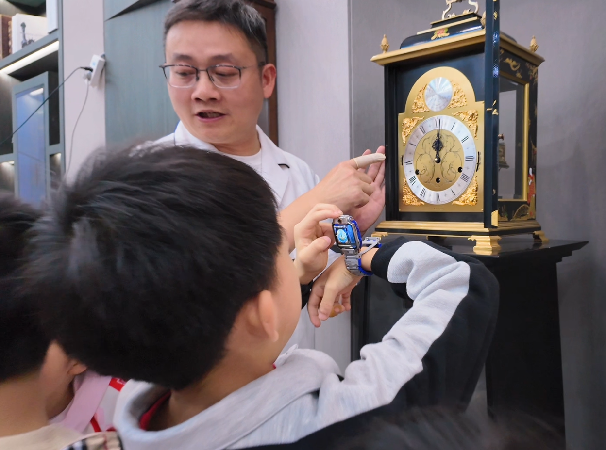 活动首站聚焦“时间认知”展开。钟表维修区专业老师系统讲解机械机芯结构、指针运转规律及校准原理,巧妙将“机械精准”与“高效规划”关联,用“大脑小管家”的生动比喻解答孩子们“时间快慢”的疑惑。理论课后,小记者分组动手拆卸机芯,在“咔嗒”机械声中感受“分秒必争”。随后,大家走进老亨达利钟表维修车间,观摩专业技师的精细操作,直观理解“时间精准”背后所代表的专注与责任,知识与实践的碰撞让抽象概念具象化。