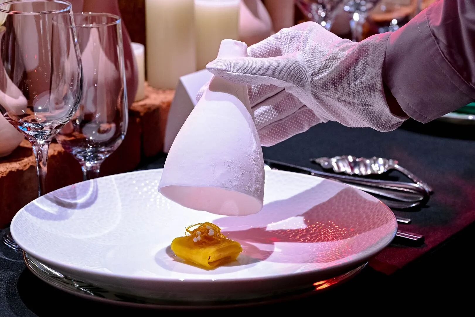 晚宴菜品以明代甜白釉高足碗的诞生窑艺为美学线索,将制窑六艺“取土、塑胎、修胚、施釉、窑炼、成器”化入珍馐,终以甜白釉集大成之器,承燕窝滋补之极。