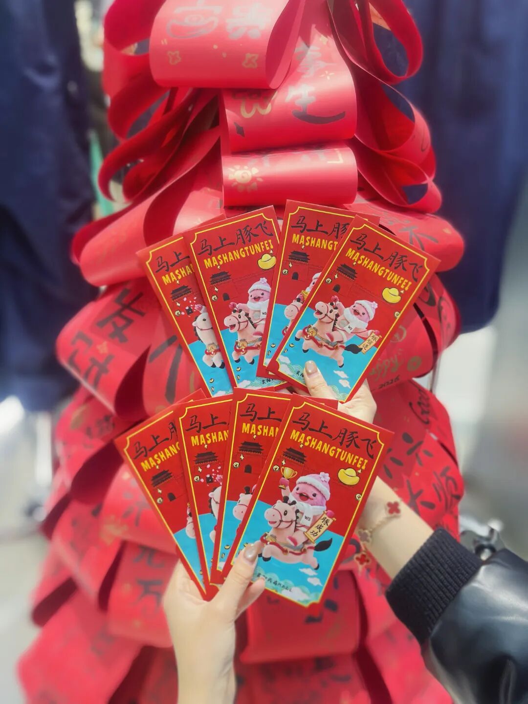 襄阳武商MALL以武商IP江豚为主题形象,融合襄阳临汉门、汉水文化及书法名家题字,推出六款主题冰箱贴及新春红包,兼具艺术审美与地域辨识度。市民通过观展打卡、专柜消费即可获取精美年礼,其中,新春红包迅速成为市民争相收藏的“年俗臻礼”,进一步提升了武商IP文化传播力。